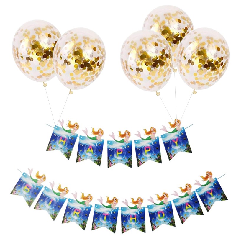 Set 5 baloane confetti auriu si banner Happy Birthday ocean, sirena
